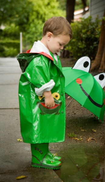 I know all you other Californians are rolling your eyes at me right now, but I have to say I am loving this weather. We got this great rain outfit from a close family friend a couple of years ago, thanks Kath, and just had to try it out with Jace even though it is supposed to be for a 5 year old! Check out the boots and hilarious umbrella…so cute!! We have been having so much fun jumping in puddles, floating leaves down the gutters, and just standing around feeling the rain hit our faces! I feel like we are finally having our winter around here; I haven’t seen the sun much for a week and I must say, I am not bothered in the least. I guess my genetic background might help here, most of my family lives in England and I was born and lived there till I was 3 or 4. I supposed I was destined for a life of crummy weather and just happened to get lucky and have adventurous parents who decided to move to California. Don’t worry guys, the sun will come back soon!
